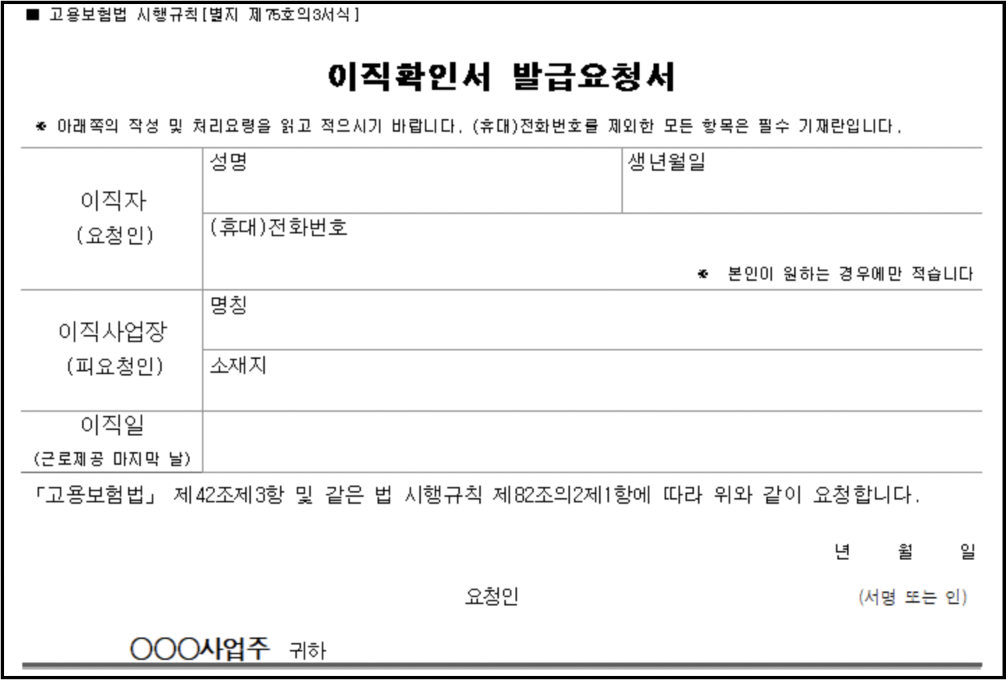 아래 이직확인서 발급 요청서를 그대로 다운로드하셔서 성명, 생년월일 등 기본적인 사항을 입력한 후 관할 근로복지공단 팩스로 서류를 보내면 됩니다.